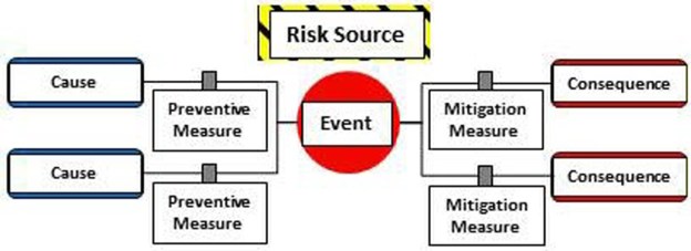 Bowtie diagrams are a tool to manage risk. A company’s safety team begins in the middle of the diagram, identifying the Risk Source (e.g., COVID-19) and the Event (e.g., a worker contracts coronavirus). Then, on the left side, the team identifies controls – ways to prevent the risk – and, on the right side ways to mitigate (reduce) the damage if the control measures fail and the hazard/risk happens.